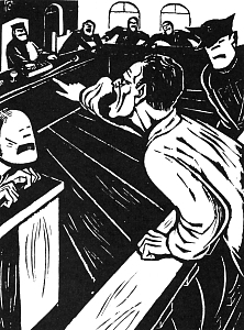 Der Angeklagte wird zum Kläger, Linolschnitt, 1938